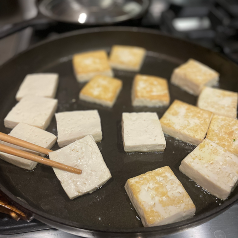 Heat the 1 tbsp in an ideally nonstick skillet over medium heat. Add the tofu blocks and start searing. Flip after a few minutes to get some nice golden brown color on the other side.